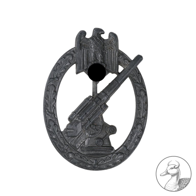 Militärisches Kampfabzeichen der deutschen Wehrmacht im Zweiten Weltkrieg, verliehen an Mitglieder der Heeres-Flak-Artillerie. Feinzink halbvoll. Sehr seltene Feinzinkausführung unmarkiert vom Hersteller Förster und Barth Pforzheim, mit bauchiger Nadel.